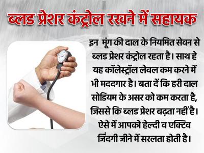 इन मूंग की दाल के नियमित सेवन से ब्लड प्रेशर कंट्रोल रहता है। साथ हे यह कॉलेस्ट्रॉल लेवल कम करने में भी मददगार है। बता दें कि हरी दाल सोडियम के असर को कम करता है, जिससे कि ब्लड प्रेशर बढ़ता नहीं है। ऐसे में आपको हेल्दी व एक्टिव जिंदगी जीने में सरलता होती है।