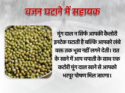 मूंग दाल न सिर्फ आपकी कैलोरी इनटेक घटाती है बल्कि आपको लंबे वक्त तक भूख नहीं लगने देती। रात के खाने में आप चपाती के साथ एक कटोरी मूंग दाल खाने से आपको भरपूर पोषण मिल जाएगा।
