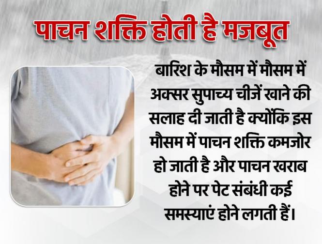 बारिश के मौसम में मौसम में अक्सर सुपाच्य चीजें खाने की सलाह दी जाती है क्योंकि इस मौसम में पाचन शक्ति कमजोर हो जाती है और पाचन खराब होने पर पेट संबंधी कई समस्याएं होने लगती हैं।