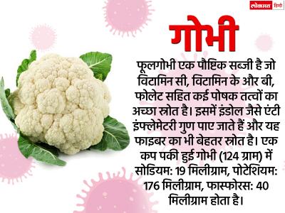 फूलगोभी एक पौष्टिक सब्जी है जो विटामिन सी, विटामिन के और बी, फोलेट सहित कई पोषक तत्वों का अच्छा स्रोत है। इसमें इंडोल जैसे एंटी इंफ्लेमेटरी गुण पाए जाते हैं और यह फाइबर का भी बेहतर स्रोत है। एक कप पकी हुई गोभी (124 ग्राम) में सोडियम: 19 मिलीग्राम, पोटेशियम: 176 मिलीग्राम, फास्फोरस: 40 मिलीग्राम होता है।