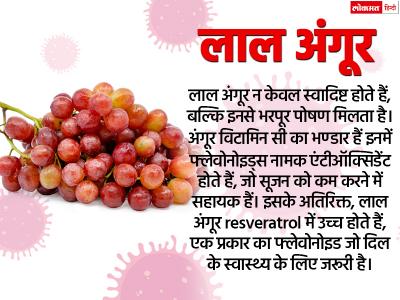 लाल अंगूर न केवल स्वादिष्ट होते हैं, बल्कि इनसे भरपूर पोषण मिलता है। अंगूर विटामिन सी का भण्डार हैं इनमें फ्लेवोनोइड्स नामक एंटीऑक्सिडेंट होते हैं, जो सूजन को कम करने में सहायक हैं। इसके अतिरिक्त, लाल अंगूर resveratrol में उच्च होते हैं, एक प्रकार का फ्लेवोनोइड जो दिल के स्वास्थ्य के लिए जरूरी है।