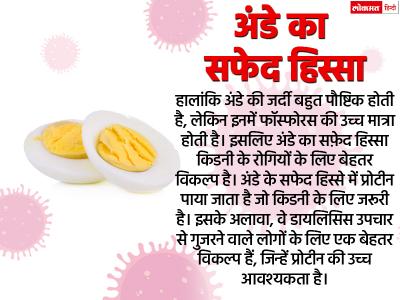 हालांकि अंडे की जर्दी बहुत पौष्टिक होती है, लेकिन इनमें फॉस्फोरस की उच्च मात्रा होती है। इसलिए अंडे का सफ़ेद हिस्सा किडनी के रोगियों के लिए बेहतर विकल्प है। अंडे के सफेद हिस्से में प्रोटीन पाया जाता है जो किडनी के लिए जरूरी है। इसके अलावा, वे डायलिसिस उपचार से गुजरने वाले लोगों के लिए एक बेहतर विकल्प हैं, जिन्हें प्रोटीन की उच्च आवश्यकता है।