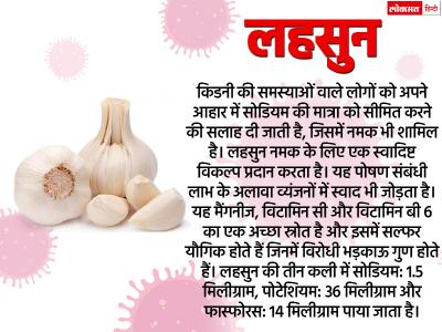 किडनी की समस्याओं वाले लोगों को अपने आहार में सोडियम की मात्रा को सीमित करने की सलाह दी जाती है, जिसमें नमक भी शामिल है। लहसुन नमक के लिए एक स्वादिष्ट विकल्प प्रदान करता है। यह पोषण संबंधी लाभ के अलावा व्यंजनों में स्वाद भी जोड़ता है। यह मैंगनीज, विटामिन सी और विटामिन बी 6 का एक अच्छा स्रोत है और इसमें सल्फर यौगिक होते हैं जिनमें विरोधी भड़काऊ गुण होते हैं। लहसुन की तीन कली में सोडियम: 1.5 मिलीग्राम, पोटेशियम: 36 मिलीग्राम और फास्फोरस: 14 मिलीग्राम पाया जाता है।