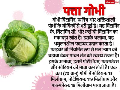 गोभी विटामिन, खनिज और शक्तिशाली पौधों के यौगिकों से भरी हुई है। यह विटामिन के, विटामिन सी, और कई बी विटामिन का एक बड़ा स्रोत है। इसके अलावा, यह अघुलनशील फाइबर प्रदान करता है। फाइबर जो नियमित रूप से मल त्याग को बढ़ावा देकर पाचन तंत्र को स्वस्थ रखता है। इसके अलावा, इसमें पोटेशियम, फास्फोरस और सोडियम की मात्रा कम होती है। एक कप (70 ग्राम) गोभी में सोडियम: 13 मिलीग्राम, पोटेशियम: 119 मिलीग्राम और फास्फोरस: 18 मिलीग्राम पाया जाता है।