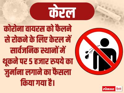 कोरोना वायरस को फैलने से रोकने के लिए केरल में सार्वजनिक स्थानों में थूकने पर 5 हजार रुपये का जुर्माना लगाने का फैसला किया गया है। पुलिस के अनुसार, यह नियम केरला पुलिस के एक्ट के सेक्शन 120(e) के तहत लिया गया है। जो व्यक्ति जुर्माना नहीं देगा, उसे एक साल की सजा हो सकती है।