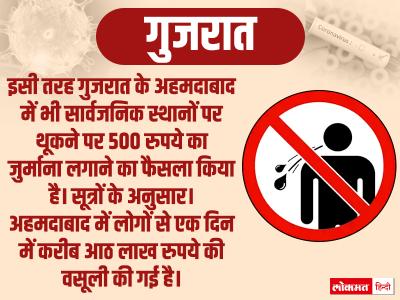 इसी तरह गुजरात के अहमदाबाद में भी सार्वजनिक स्थानों पर थूकने पर 500 रुपये का जुर्माना लगाने का फैसला किया है। सूत्रों के अनुसार। अहमदाबाद में लोगों से एक दिन में करीब आठ लाख रुपये की वसूली की गई है।