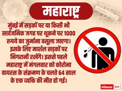मुंबई में सड़कों पर या किसी भी सार्वजनिक जगह पर थूकने पर 1000 रुपये का जुर्माना वसूला जाएगा। इसके लिए मार्शल सड़कों पर निगरानी रखेंगे। इससे पहले महाराष्ट्र में मंगलवार को कोरोना वायरस के संक्रमण के चलते 64 साल के एक व्यक्ति की मौत हो गई।