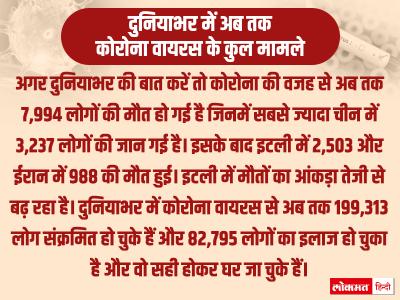 अगर दुनियाभर की बात करें तो कोरोना की वजह से अब तक 7,994 लोगों की मौत हो गई है जिनमें सबसे ज्यादा चीन में 3,237 लोगों की जान गई है।