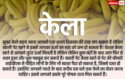 सुबह केले खाना खाना आपको एक अच्छा विकल्प की तरह लग सकता है लेकिन खाली पेट खाने से इससे आपका ऊर्जा का स्तर को कम हो सकता है। बेशक केला खाने से आपको तुरंत ऊर्जा मिलती है लेकिन लेकिन कुछ घंटों के बाद आप फिर से थका हुआ और भूख महसूस कर सकते हैं। खाली पेट केला खाने से पेट की बीमारी आईबीएस से पीड़ित लोगों के लिए भी खतरा पैदा हो सकता है, जिससे दस्त हो सकते हैं। इसलिए आपको नाश्ते के बाद करीब दस बजे तक केले का सेवन करना चाहिए। इससे आपको इसके पूरे पोषक तत्व मिल सकते हैं।