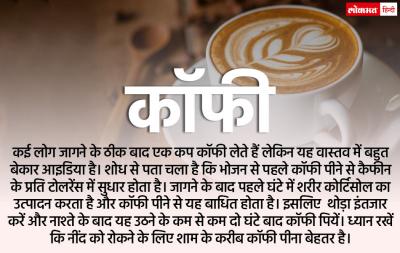 कई लोग जागने के ठीक बाद एक कप कॉफी लेते हैं लेकिन यह वास्तव में बहुत बेकार आइडिया है। शोध से पता चला है कि भोजन से पहले कॉफी पीने से कैफीन के प्रति टोलरेंस में सुधार होता है। जागने के बाद पहले घंटे में शरीर कोर्टिसोल का उत्पादन करता है और कॉफी पीने से यह बाधित होता है। इसलिए थोड़ा इंतजार करें और नाश्ते के बाद यह उठने के कम से कम दो घंटे बाद कॉफी पियें। ध्यान रखें कि नींद को रोकने के लिए शाम के करीब कॉफी पीना बेहतर है।