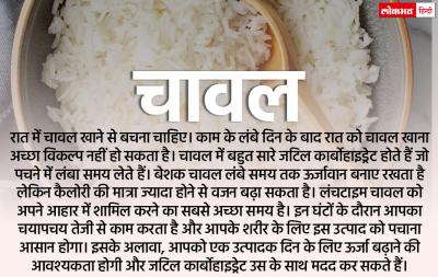 रात में चावल खाने से बचना चाहिए। काम के लंबे दिन के बाद रात को चावल खाना अच्छा विकल्प नहीं हो सकता है। चावल में बहुत सारे जटिल कार्बोहाइड्रेट होते हैं जो पचने में लंबा समय लेते हैं। बेशक चावल लंबे समय तक ऊर्जावान बनाए रखता है लेकिन कैलोरी की मात्रा ज्यादा होने से वजन बढ़ा सकता है। लंचटाइम चावल को अपने आहार में शामिल करने का सबसे अच्छा समय है। इन घंटों के दौरान आपका चयापचय तेजी से काम करता है और आपके शरीर के लिए इस उत्पाद को पचाना आसान होगा। इसके अलावा, आपको एक उत्पादक दिन के लिए ऊर्जा बढ़ाने की आवश्यकता होगी और जटिल कार्बोहाइड्रेट उस के साथ मदद कर सकते हैं।