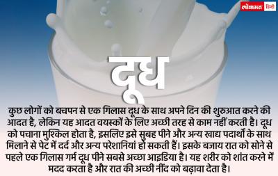 कुछ लोगों को बचपन से एक गिलास दूध के साथ अपने दिन की शुरुआत करने की आदत है, लेकिन यह आदत वयस्कों के लिए अच्छी तरह से काम नहीं करती है। दूध को पचाना मुश्किल होता है, इसलिए इसे सुबह पीने और अन्य खाद्य पदार्थों के साथ मिलाने से पेट में दर्द और अन्य परेशानियां हो सकती हैं। इसके बजाय रात को सोने से पहले एक गिलास गर्म दूध पीने सबसे अच्छा आइडिया है। यह शरीर को शांत करने में मदद करता है और रात की अच्छी नींद को बढ़ावा देता है।