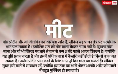 मांस प्रोटीन और बी विटामिन का एक बड़ा स्रोत है, लेकिन यह पाचन तंत्र पर अत्यधिक भार डाल सकता है। इसीलिए रात को मीट खाना बेहतर उपाय नहीं है। दुबला मांस खाना और वो भी बिस्तर पर जाने से कम से कम 3 घंटे पहले अच्छा विकल्प है। क्योंकि यह तृप्ति प्रदान करता है और इसमें अधिक मात्रा में कैलोरी नहीं होती है जिससे वजन बढ़ सकता है। पर्याप्त प्रोटीन प्राप्त करने के लिए आप पूरे दिन मांस खा सकते हैं। लेकिन सुबह इसे खाने से सावधान रहें, क्योंकि इस तरह का भारी भोजन आपके शरीर को पचाने में बहुत मुश्किल हो सकता है।