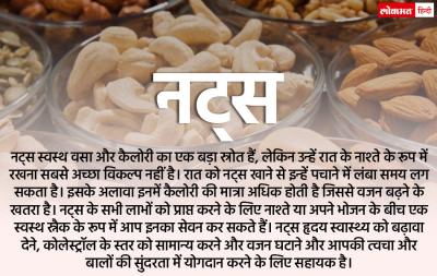 नट्स स्वस्थ वसा और कैलोरी का एक बड़ा स्रोत हैं, लेकिन उन्हें रात के नाश्ते के रूप में रखना सबसे अच्छा विकल्प नहीं है। रात को नट्स खाने से इन्हें पचाने में लंबा समय लग सकता है। इसके अलावा इनमें कैलोरी की मात्रा अधिक होती है जिससे वजन बढ़ने के खतरा है। नट्स के सभी लाभों को प्राप्त करने के लिए नाश्ते या अपने भोजन के बीच एक स्वस्थ स्नैक के रूप में आप इनका सेवन कर सकते हैं। नट्स हृदय स्वास्थ्य को बढ़ावा देने, कोलेस्ट्रॉल के स्तर को सामान्य करने और वजन घटाने और आपकी त्वचा और बालों की सुंदरता में योगदान करने के लिए सहायक है।