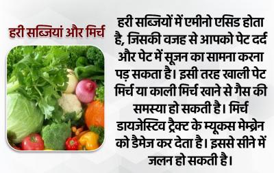 हरी सब्जियों में एमीनो एसिड होता है, जिसकी वजह से आपको पेट दर्द और पेट में सूजन का सामना करना पड़ सकता है। इसी तरह खाली पेट मिर्च या काली मिर्च खाने से गैस की समस्या हो सकती है। मिर्च डायजेस्टिव ट्रैक्ट के म्यूकस मेम्ब्रेन को डैमेज कर देता है। इससे सीने में जलन हो सकती है।