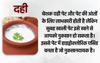 बेशक दही पेट और पेट की आंतों के लिए लाभकारी होती है लेकिन सुबह खाली पेट इसे खाने से आपको नुकसान हो सकता है। इससे पेट में हाइड्रोक्लोरिक एसिड बनता है जो नुकसानदायक है।