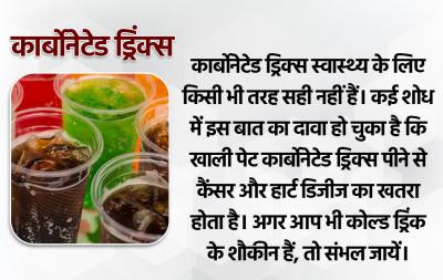 कार्बोनेटेड ड्रिक्स स्वास्थ्य के लिए किसी भी तरह सही नहीं हैं। कई शोध में इस बात का दावा हो चुका है कि खाली पेट कार्बोनेटेड ड्रिक्स पीने से कैंसर और हार्ट डिजीज का खतरा होता है। अगर आप भी कोल्ड ड्रिंक के शौकीन हैं, तो संभल जायें।