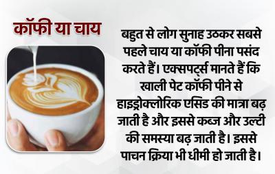 बहुत से लोग सुनाह उठकर सबसे पहले चाय या कॉफी पीना पसंद करते हैं। एक्सपर्ट्स मानते हैं कि खाली पेट कॉफी पीने से हाइड्रोक्लोरिक एसिड की मात्रा बढ़ जाती है और इससे कब्ज और उल्टी की समस्या बढ़ जाती है। इससे पाचन क्रिया भी धीमी हो जाती है।