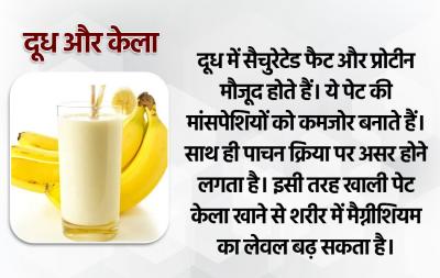 दूध में सैचुरेटेड फैट और प्रोटीन मौजूद होते हैं। ये पेट की मांसपेशियों को कमजोर बनाते हैं। साथ ही पाचन क्रिया पर असर होने लगता है। इसी तरह खाली पेट केला खाने से शरीर में मैग्नीशियम का लेवल बढ़ सकता है।