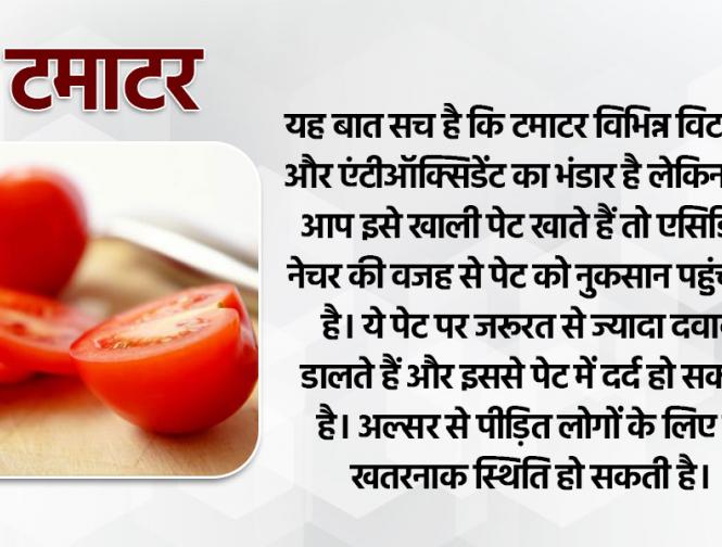 यह बात सच है कि टमाटर विभिन्न विटामिन और एंटीऑक्सिडेंट का भंडार है लेकिन जब आप इसे खाली पेट खाते हैं तो एसिडिक नेचर की वजह से पेट को नुकसान पहुंचाता है। ये पेट पर जरूरत से ज्यादा दवाब डालते हैं और इससे पेट में दर्द हो सकता है। अल्सर से पीड़ित लोगों के लिए ये खतरनाक स्थिति हो सकती है।