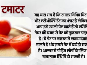 1 / 8यह बात सच है कि टमाटर विभिन्न विटामिन और एंटीऑक्सिडेंट का भंडार है लेकिन जब आप इसे खाली पेट खाते हैं तो एसिडिक नेचर की वजह से पेट को नुकसान पहुंचाता है। ये पेट पर जरूरत से ज्यादा दवाब डालते हैं और इससे पेट में दर्द हो सकता है। अल्सर से पीड़ित लोगों के लिए ये खतरनाक स्थिति हो सकती है।2 / 8खट्टे फल जैसे संतरा, अंगूर, नींबू जैसी चीजें विटामिन सी, फाइबर और एंटीऑक्सिडेंट से भरपूर होती हैं लेकिन अगर आप सुबह खाली पेट इनका सेवन करते हैं तो आपके पेट की समस्या हो सकती है।3 / 8हरी सब्जियों में एमीनो एसिड होता है, जिसकी वजह से आपको पेट दर्द और पेट में सूजन का सामना करना पड़ सकता है। इसी तरह खाली पेट मिर्च या काली मिर्च खाने से गैस की समस्या हो सकती है। मिर्च डायजेस्टिव ट्रैक्ट के म्यूकस मेम्ब्रेन को डैमेज कर देता है। इससे सीने में जलन हो सकती है। 4 / 8बेशक दही पेट और पेट की आंतों के लिए लाभकारी होती है लेकिन सुबह खाली पेट इसे खाने से आपको नुकसान हो सकता है। इससे पेट में हाइड्रोक्लोरिक एसिड बनता है जो नुकसानदायक है। 5 / 8खाली पेट मिठी चीजें खाने से लीवर और पाचक-ग्रंथि पर दबाव बढ़ जाता है। इससे इनके काम करने की क्षमता प्रभावित होती है। लंबे समय में देखा जाए तो इसकी वजह से बीमारियां भी जन्म ले सकती हैं।6 / 8कार्बोनेटेड ड्रिक्स स्वास्थ्य के लिए किसी भी तरह सही नहीं हैं। कई शोध में इस बात का दावा हो चुका है कि खाली पेट कार्बोनेटेड ड्रिक्स पीने से कैंसर और हार्ट डिजीज का खतरा होता है। अगर आप भी कोल्ड ड्रिंक के शौकीन हैं, तो संभल जायें।7 / 8बहुत से लोग सुनाह उठकर सबसे पहले चाय या कॉफी पीना पसंद करते हैं। एक्सपर्ट्स मानते हैं कि खाली पेट कॉफी पीने से हाइड्रोक्लोरिक एसिड की मात्रा बढ़ जाती है और इससे कब्ज और उल्टी की समस्या बढ़ जाती है। इससे पाचन क्रिया भी धीमी हो जाती है। 8 / 8दूध में सैचुरेटेड फैट और प्रोटीन मौजूद होते हैं। ये पेट की मांसपेशियों को कमजोर बनाते हैं। साथ ही पाचन क्रिया पर असर होने लगता है। इसी तरह खाली पेट केला खाने से शरीर में मैग्नीशियम का लेवल बढ़ सकता है।