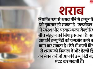1 / 10नियमित रूप से शराब पीने से इम्यून सिस्टम को नुकसान हो सकता है। एल्कोहल आंत में स्वस्थ और अस्वास्थ्यकर बैक्टीरिया के बीच संतुलन को बिगाड़ सकता है। साथ ही आपकी इम्यूनिटी को कमजोर करने का भी काम कर सकता है। ऐसे में अपनी दिनचर्या से शराब को निकाल दें और हेल्दी ड्रिंक्स का सेवन करें जो आपकी इम्यूनिटी बढ़ाने में मदद कर सकती हैं।2 / 10इम्यूनिटी बढ़ाने के लिए सबसे ज्यादा जरूरी आपका भोजन होता है। हेल्दी खाना आपके इम्यून सिस्टम को बूस्ट करने में मदद कर सकता है। रिफाइंड कार्ब्स, चीनी और नमक से भरपूर आहार इम्यून सिस्टम कमजोर कर सकते हैं। प्रोसेस्ड फूड्स हमारे शरीर में गुड बैक्टीरिया कम कर सकते हैं। अपने खाने में प्याज, लहसुन, अदरक का इस्तेमाल करें। 3 / 10ज्यादातर फास्ट फूड बनाने शुगर का इस्तेमाल होता है और इनमें फाइबर की मात्रा काफी कम पाई जाती है। फास्ट फूड शरीर का इम्यून सिस्टम धीरे-धीरे खराब करता है।4 / 10सोडा इंसान के इम्यून सिस्टम को कमजोर करने के लिए जिम्मेदार हो सकता है। सोडा में शुगर की मात्रा काफी ज्यादा होता है जो इंसुनिल में शुगर लेवल भी बढ़ाती हैं।5 / 10यदि आप खाना बनाने में बार-बार एक ही तेल का इस्तेमाल करते हैं तो ये आपकी सेहत के लिए खतरनाक हो सकता है। इस तरह का तेल आपके इम्यून सिस्मट को खराब करता है।6 / 10कुछ लोग कॉफी पीने के काफी शौकीन होते हैं। शायद वो लोग इस बात से अंजान हैं कि कॉफी में पाए जाने वाला कैफीन इम्यून को प्रभावित करता है। इसलिए कॉफी पीने पर कंट्रोल होना बहुत जरूरी है।7 / 10बेरीज स्वास्थ्य के लिए बहुत अच्छे हैं, लेकिन स्ट्रॉबेरी सही नहीं है। स्ट्रॉबेरी का बहुत अधिक सेवन आपकी प्रतिरोधक क्षमता को कम कर सकता है। स्ट्रॉबेरी हिस्टामाइन नामक एक घटक को छोड़ता है, जिससे जमाव होता है। हिस्टामाइन में वृद्धि से आपकी नाक में असुविधा हो सकती है और साइनस से जुड़ी समस्याएं हो सकती हैं।8 / 10इसके अलावा प्रोसेस्ड मीट भी आपकी इम्यूनिटी सिस्टम को खराब करने के लिए जिम्मेदार हो सकता है। बासी खाना भी अपनी डाइट से दूर रखना ही समझदारी होगी। कई घंटों का बासी खाना इंसान आपकी सेहत पर बुरा असर डालता है।9 / 10विश्व स्वास्थ्य संगठन की सिफारिशों के अनुसार वयस्कों को एक दिन में 5 ग्राम नमक से ज्यादा नमक नहीं लेना चाहिए। यह मात्रा करीब एक टीस्पून के बराबर है। जर्मनी के बॉन विश्वविद्यालय के शोधकर्ता क्रिश्चियन कुर्ट्स का कहना है- 'हम अब पहली बार ये साबित कर पाए हैं कि ज्यादा नमक का सेवन इम्यून सिस्टम को कमजोर कर देता है।'10 / 10थोड़ा बहुत मीठा खाने से कोई नुकसान नहीं होता है लेकिन कैंडीज और जेली जैसी चीजों का लंबे समय तक सेवन करने से स्वास्थ्य बुरी प्रभावित हो सकता है। चीनी से भरी कैंडीज सूजन का कारण बनता है और य
