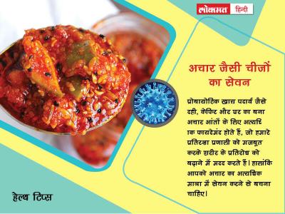 प्रोबायोटिक खाद्य पदार्थ जैसे दही, केफिर और घर का बना अचार आंतों के लिए अत्यधिक फायदेमंद होते हैं, जो हमारे प्रतिरक्षा प्रणाली को मजबूत करके शरीर के प्रतिरोध को बढ़ाने में मदद करते हैं। हालांकि आपको अचार का अत्यधिक मात्रा में सेवन करने से बचना चाहिए। नमकीन उत्पादों में नमक की मात्रा पेट की परत को नुकसान पहुँचाती है। बहुत से ऐसे खाद्य पदार्थों का सेवन करने से पुरानी बीमारियों (जैसे उच्च रक्तचाप और हृदय रोग) वाले लोगों में स्वास्थ्य समस्याएं पैदा हो सकती हैं और प्रतिरक्षा प्रणाली कमजोर हो सकती है।