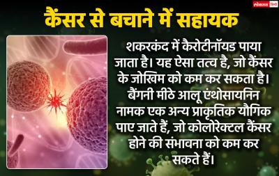 शकरकंद में कैरोटीनॉयड पाया जाता है। यह ऐसा तत्व है, जो कैंसर के जोखिम को कम कर सकता है। बैंगनी मीठे आलू एंथोसायनिन नामक एक अन्य प्राकृतिक यौगिक पाए जाते हैं, जो कोलोरेक्टल कैंसर होने की संभावना को कम कर सकते हैं।