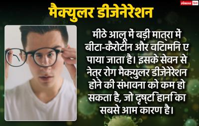 मीठे आलू में बड़ी मात्रा में बीटा-कैरोटीन और विटामिन ए पाया जाता है। इसके सेवन से नेत्र रोग मैक्युलर डीजेनेरेशन होने की संभावना को कम हो सकता है, जो दृष्टि हानि का सबसे आम कारण है।