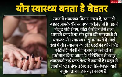 स्वाद में शकरकंद जितना अच्छा है, उतना ही बेहतर आपके यौन स्वास्थ्य के लिए भी है। इसमें मौजूद पोटेशियम, बीटा-कैरोटीन जैसे तत्व आपको ब्लड प्रेशर और हृदय की समस्याओं से बचाकर यौन स्वास्थ्य में सुधार करते हैं। कई देशों में यौन स्वास्थ्य के लिए एस्ट्रोजेन थेरेपी और फर्टिलिटी थेरेपी की बजाय शकरकंदी का इस्तेमाल किया जाता है। पोटेशियम से भरपूर शकरकंदी हाई ब्लड प्रेशर से बचाती है। बहुत से लोगों में ब्लड प्रेशर इरेक्टाइल डिस्फंक्शन यानी नपुंसकता का एक बड़ा कारण है।