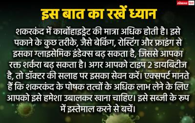 शकरकंद में कार्बोहाइड्रेट की मात्रा अधिक होती है। इसे पकाने के कुछ तरीके, जैसे बेकिंग, रोस्टिंग और फ्राइंग से इसका ग्लाइसेमिक इंडेक्स बढ़ सकता है, जिससे आपका रक्त शर्करा बढ़ सकता है। अगर आपको टाइप 2 डायबिटीज है, तो डॉक्टर की सलाह पर इसका सेवन करें। एक्सपर्ट मानते हैं कि शकरकंद के पोषक तत्वों के अधिक लाभ लेने के लिए आपको इसे हमेशा उबालकर खाना चाहिए। इसे सब्जी के रूप में इस्तेमाल करने से बचें।
