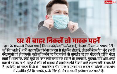 हाल के अध्ययनों में पाया गया है कि जब कोई व्यक्ति बोलता है, तो लार की लगभग 1000 छोटी बूंदें निकलती हैं। यदि वह व्यक्ति कोरोना वायरस से संक्रमित होता है, तो इनमें से प्रत्येक बूंद हजारों कीटाणुओं को ले जाएगी। बड़ी बूंदें जमीन पर गिर जाएंगी जो आमतौर पर एक मीटर की दूरी के भीतर जाती हैं। हालांकि, छोटी बूंदों का प्लम लंबे समय तक हवा में तैर सकता है, मुख्यतः यदि क्षेत्र अच्छी तरह से हवादार न हो।