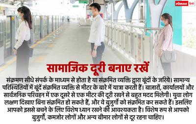 संक्रमण सीधे संपर्क के माध्यम से होता है या संक्रमित व्यक्ति द्वारा बूंदों के जरिये। सामान्य परिस्थितियों में बूंदें संक्रमित व्यक्ति से मीटर के बारे में यात्रा करती हैं। बाजारों, कार्यालयों और सार्वजनिक परिवहन में एक दूसरे से एक मीटर की दूरी रखने से बहुत मदद मिलेगी। युवा लोग लक्षण दिखाए बिना संक्रमित हो सकते हैं, और वे बुजुर्गों को संक्रमित कर सकते हैं।