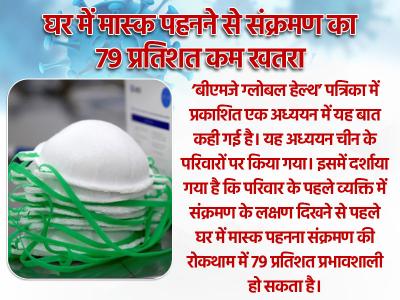 ‘बीएमजे ग्लोबल हेल्थ’ पत्रिका में प्रकाशित एक अध्ययन में यह बात कही गई है। यह अध्ययन चीन के परिवारों पर किया गया। इसमें दर्शाया गया है कि परिवार के पहले व्यक्ति में संक्रमण के लक्षण दिखने से पहले घर में मास्क पहनना संक्रमण की रोकथाम में 79 प्रतिशत प्रभावशाली हो सकता है।
