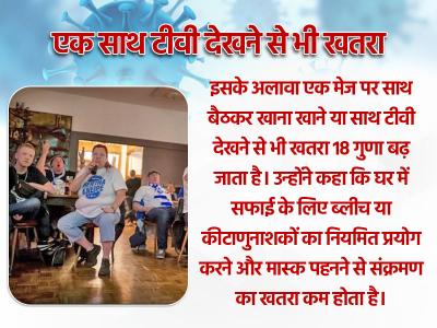 इसके अलावा एक मेज पर साथ बैठकर खाना खाने या साथ टीवी देखने से भी खतरा 18 गुणा बढ़ जाता है। उन्होंने कहा कि घर में सफाई के लिए ब्लीच या कीटाणुनाशकों का नियमित प्रयोग करने और मास्क पहनने से संक्रमण का खतरा कम होता है।