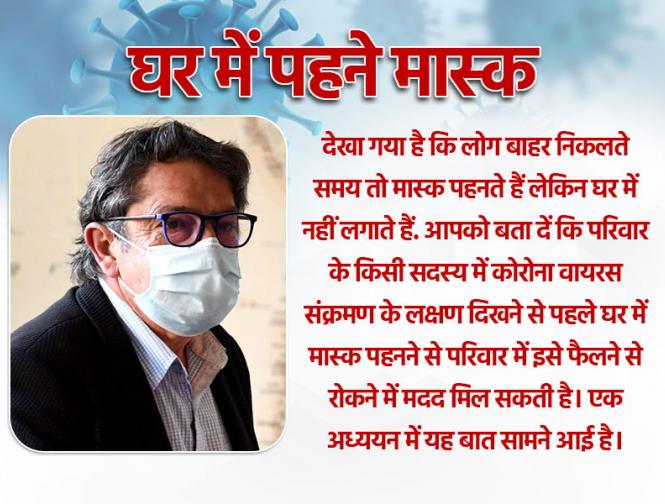 देखा गया है कि लोग बाहर निकलते समय तो मास्क पहनते हैं लेकिन घर में नहीं लगाते हैं. आपको बता दें कि परिवार के किसी सदस्य में कोरोना वायरस संक्रमण के लक्षण दिखने से पहले घर में मास्क पहनने से परिवार में इसे फैलने से रोकने में मदद मिल सकती है। एक अध्ययन में यह बात सामने आई है।