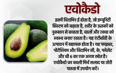 इसमें विटामिन ई होता है, जो इम्यूनिटी सिस्टम को बढ़ाता है, शरीर के ऊतकों को नुकसान से बचाता है, बालों और त्वचा को स्वस्थ बनाए रखता है। यह एंटीबॉडी के उत्पादन में सहायक होता है। यह फाइबर, पोटेशियम और विटामिन सी, के, फोलेट और बी 6 का एक अच्छा स्रोत है। एवोकैडो का काली मिर्च सलाद या तोरी पास्ता में उपयोग करें।