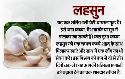 यह एक शक्तिशाली एंटी-वायरल फूड है। इसे आप कच्चा, मैश करके या सूप में डालकर खा सकते हैं। कटा हुआ कच्चा लहसुन को एक चम्मच कच्चे शहद के साथ मिलाकर खाएं और साथ में एक लौंग का भी सेवन करें। इस मिश्रण को कम से दो से तीन दिनों तक लें। यह आपकी प्रतिरक्षा प्रणाली को बढ़ावा देने का एक शानदार तरीका है।
