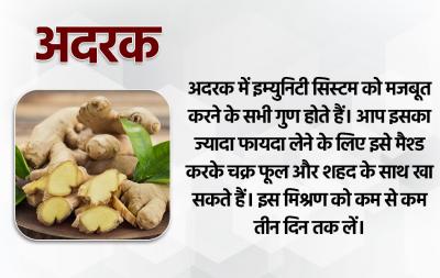 अदरक में इम्युनिटी सिस्टम को मजबूत करने के सभी गुण होते हैं। आप इसका ज्यादा फायदा लेने के लिए इसे मैश्ड करके चक्र फूल और शहद के साथ खा सकते हैं। इस मिश्रण को कम से कम तीन दिन तक लें।