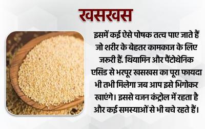 इसमें कई ऐसे पोषक तत्व पाए जाते हैं जो शरीर के बेहतर कामकाज के लिए जरूरी हैं. थियामिन और पैंटोथेनिक एसिड से भरपूर खसखस का पूरा फायदा भी तभी मिलेगा जब आप इसे भिगोकर खाएंगे। इससे वजन कंट्रोल में रहता है और कई समस्याओं से भी बचे रहते हैं।