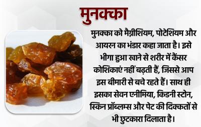 मुनक्का को मैग्नीशियम, पोटेशियम और आयरन का भंडार कहा जाता है। इसे भीगा हुआ खाने से शरीर में कैंसर कोशिकाएं नहीं बढ़ती हैं, जिससे आप इस बीमारी से बचे रहते हैं। साथ ही इसका सेवन एनीमिया, किडनी स्टोन, स्किन प्रॉब्लम्स और पेट की दिक्कतों से भी छुटकारा दिलाता है।