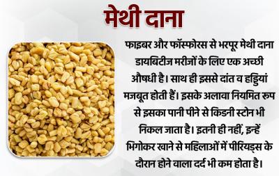 फाइबर और फॉस्फोरस से भरपूर मेथी दाना डायबिटीज मरीजों के लिए एक अच्छी औषधी है। साथ ही इससे दांत व हड्डियां मजबूत होती हैं। इसके अलावा नियमित रूप से इसका पानी पीने से किडनी स्टोन भी निकल जाता है। इतनी ही नहीं, इन्हें भिगोकर खाने से महिलाओं में पीरियड्स के दौरान होने वाला दर्द भी कम होता है।