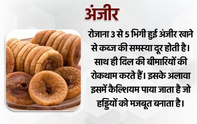 रोजाना 3 से 5 भिगी हुई अंजीर खाने से कब्ज की समस्या दूर होती है। साथ ही दिल की बीमारियों की रोकथाम करते हैं। इसके अलावा इसमें कैल्शियम पाया जाता है जो हड्डियों को मजबूत बनाता है।