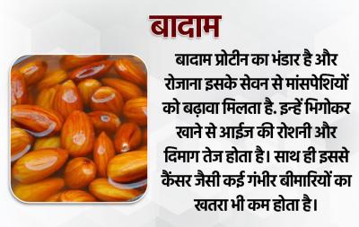 बादाम प्रोटीन का भंडार है और रोजाना इसके सेवन से मांसपेशियों को बढ़ावा मिलता है. इन्हें भिगोकर खाने से आईज की रोशनी और दिमाग तेज होता है। साथ ही इससे कैंसर जैसी कई गंभीर बीमारियों का खतरा भी कम होता है।