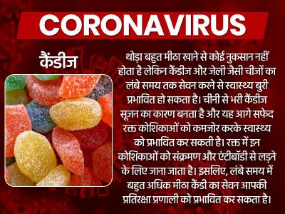 थोड़ा बहुत मीठा खाने से कोई नुकसान नहीं होता है लेकिन कैंडीज और जेली जैसी चीजों का लंबे समय तक सेवन करने से स्वास्थ्य बुरी प्रभावित हो सकता है। चीनी से भरी कैंडीज सूजन का कारण बनता है और यह आगे सफेद रक्त कोशिकाओं को कमजोर करके स्वास्थ्य को प्रभावित कर सकती है। रक्त में इन कोशिकाओं को संक्रमण और एंटीबॉडी से लड़ने के लिए जाना जाता है। इसलिए, लंबे समय में बहुत अधिक मीठा कैंडी का सेवन आपकी प्रतिरक्षा प्रणाली को प्रभावित कर सकता है और डायबिटीज और कोलेस्ट्रॉल जैसी बीमारियों को भी जन्म दे सकता है।