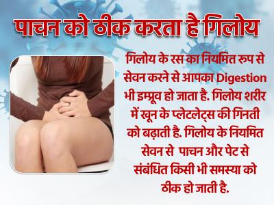 गिलोय के रस का नियमित रूप से सेवन करने से आपका Digestion भी इम्प्रूव हो जाता है. गिलोय शरीर में खून के प्लेटलेट्स की गिनती को बढ़ाती है. गिलोय के नियमित सेवन से पाचन और पेट से संबंधित किसी भी समस्या को ठीक हो जाती है.
