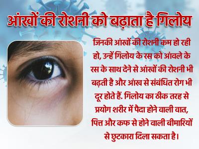 जिनकी आंखों की रोशनी कम हो रही हो, उन्हें गिलोय के रस को आंवले के रस के साथ देने से आंखों की रोशनी भी बढ़ती है और आंख से संबंधित रोग भी दूर होते हैं. गिलोय का ठीक तरह से प्रयोग शरीर में पैदा होने वाली वात, पित्त और कफ से होने वाली बीमारियों से छुटकारा दिला सकता है।