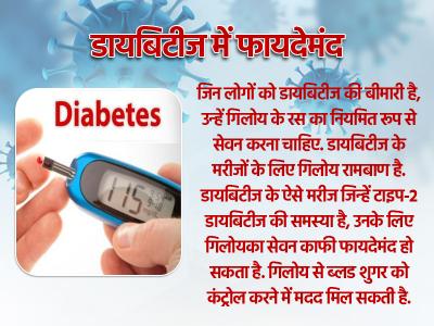 जिन लोगों को डायबिटीज की बीमारी है, उन्हें गिलोय के रस का नियमित रूप से सेवन करना चाहिए. डायबिटीज के मरीजों के लिए गिलोय रामबाण है. डायबिटीज के ऐसे मरीज जिन्हें टाइप-2 डायबिटीज की समस्या है, उनके लिए गिलोयका सेवन काफी फायदेमंद हो सकता है. गिलोय से ब्लड शुगर को कंट्रोल करने में मदद मिल सकती है.