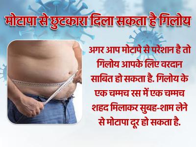 अगर आप मोटापे से परेशान है तो गिलोय आपके लिए वरदान साबित हो सकता है. गिलोय के एक चम्मच रस में एक चम्मच शहद मिलाकर सुबह-शाम लेने से मोटापा दूर हो सकता है.