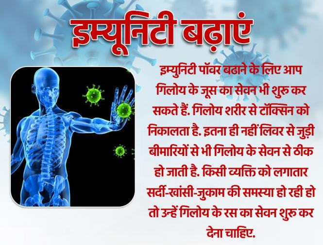 इम्युनिटी पॉवर बढाने के लिए आप गिलोय के जूस का सेवन भी शुरू कर सकते हैं. गिलोय शरीर से टॉक्सिन को निकालता है. इतना ही नहीं लिवर से जुड़ी बीमारियों से भी गिलोय के सेवन से ठीक हो जाती है. किसी व्यक्ति को लगातार सर्दी-खांसी-जुकाम की समस्या हो रही हो तो उन्हें गिलोय के रस का सेवन शुरू कर देना चाहिए.